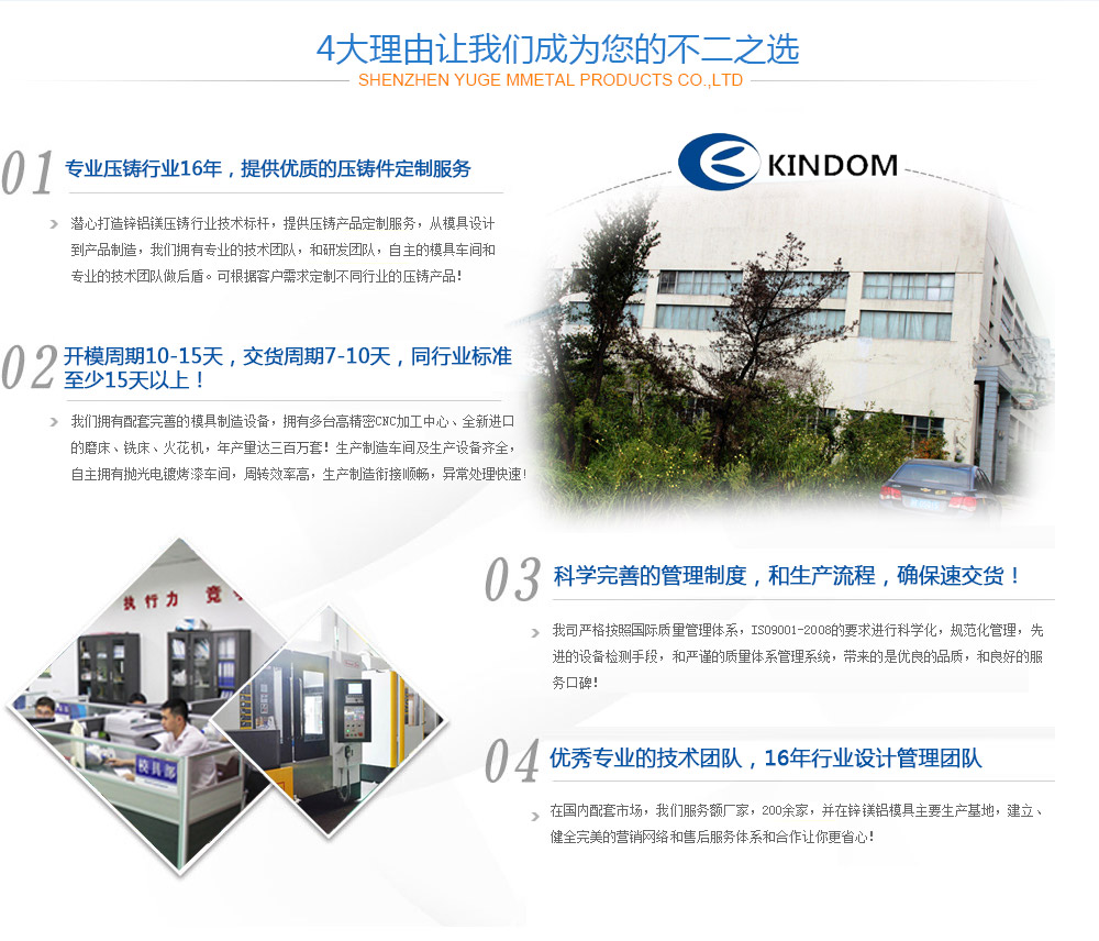 公司坐落在美麗的觀潮勝地海寧連行經(jīng)濟(jì)開發(fā)區(qū)內(nèi),距杭州18公里,緊靠杭州繞城高速(G2501)下沙出口,距江東汽車產(chǎn)業(yè)園10公里。公司占地面積33000平方米,廠房建筑面積15050平方米。擁有各種高低噸位的著名品牌壓鑄件15臺(其中800T壓鑄機(jī)2臺、500T壓鑄機(jī)2臺、280T壓鑄機(jī)5臺、135T壓鑄機(jī)6臺),還有高精密自動沖床、高精密度多軸鉆床、切邊機(jī)、表面處理等設(shè)備20余臺。公司擁有三坐標(biāo)測量儀、光譜分析儀、硬度拉力試驗機(jī)等精密計量檢測設(shè)備。